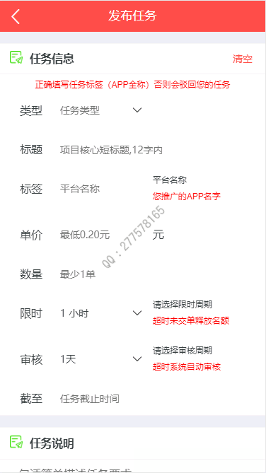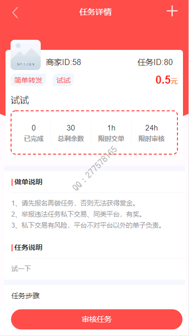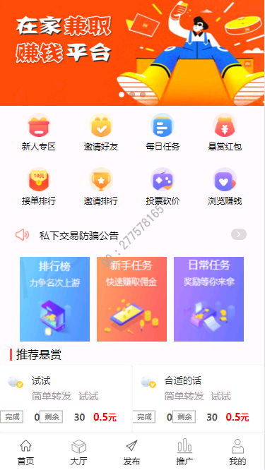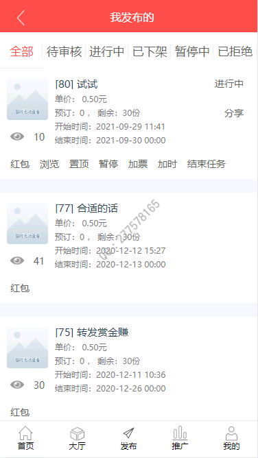 1.支持用户发布任务、置顶任务、发布任务红包、浏览任务、下架任务、分享任务